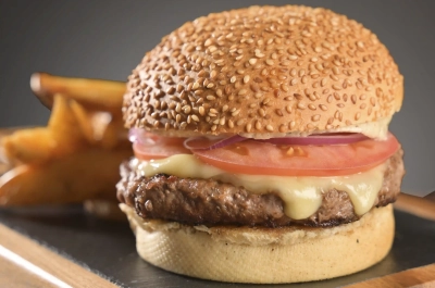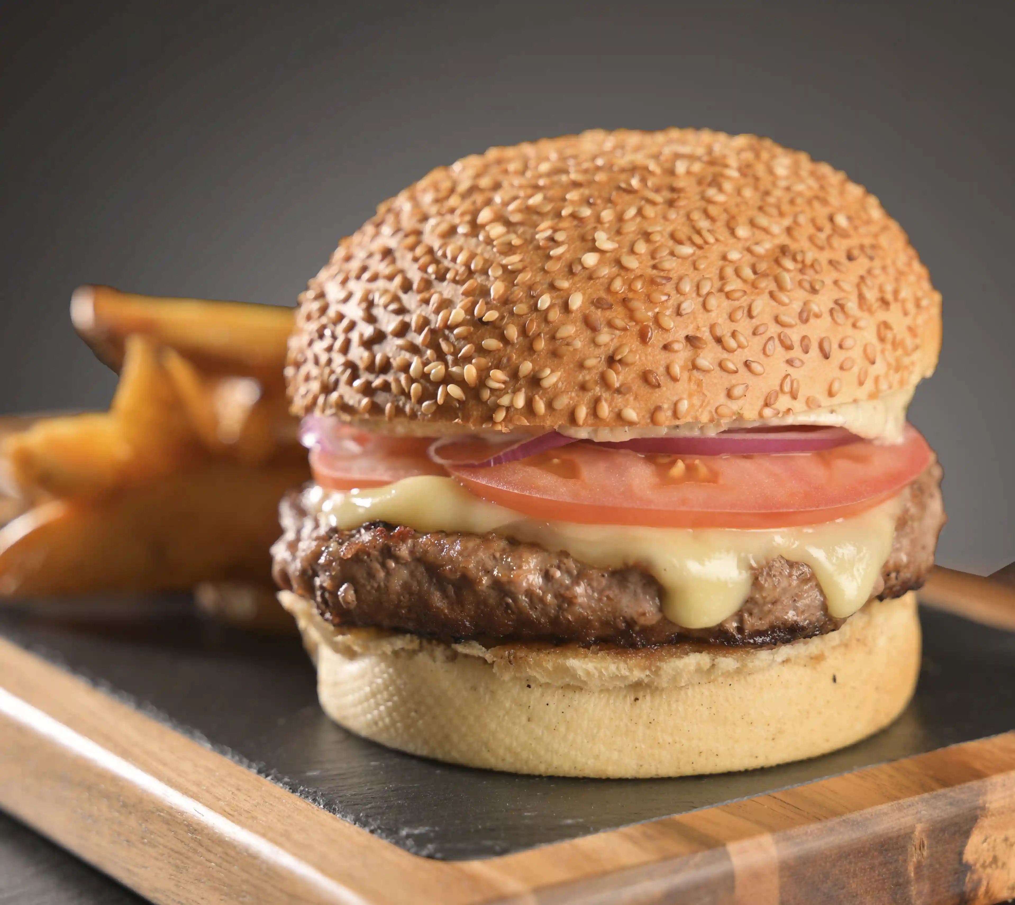 Pain Artisanal, steak charolais 150g, red cheddar fondu, tomate, oignons grillés, pickles, mayonnaise maison ketchup, s…