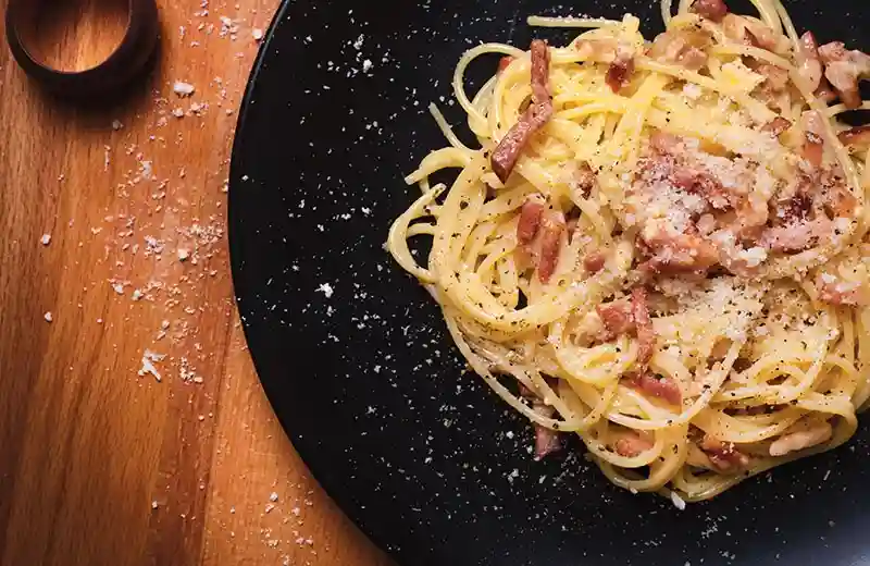 Pâtes, crème fraiche, lardons, œuf, ail, oignons, parmesan